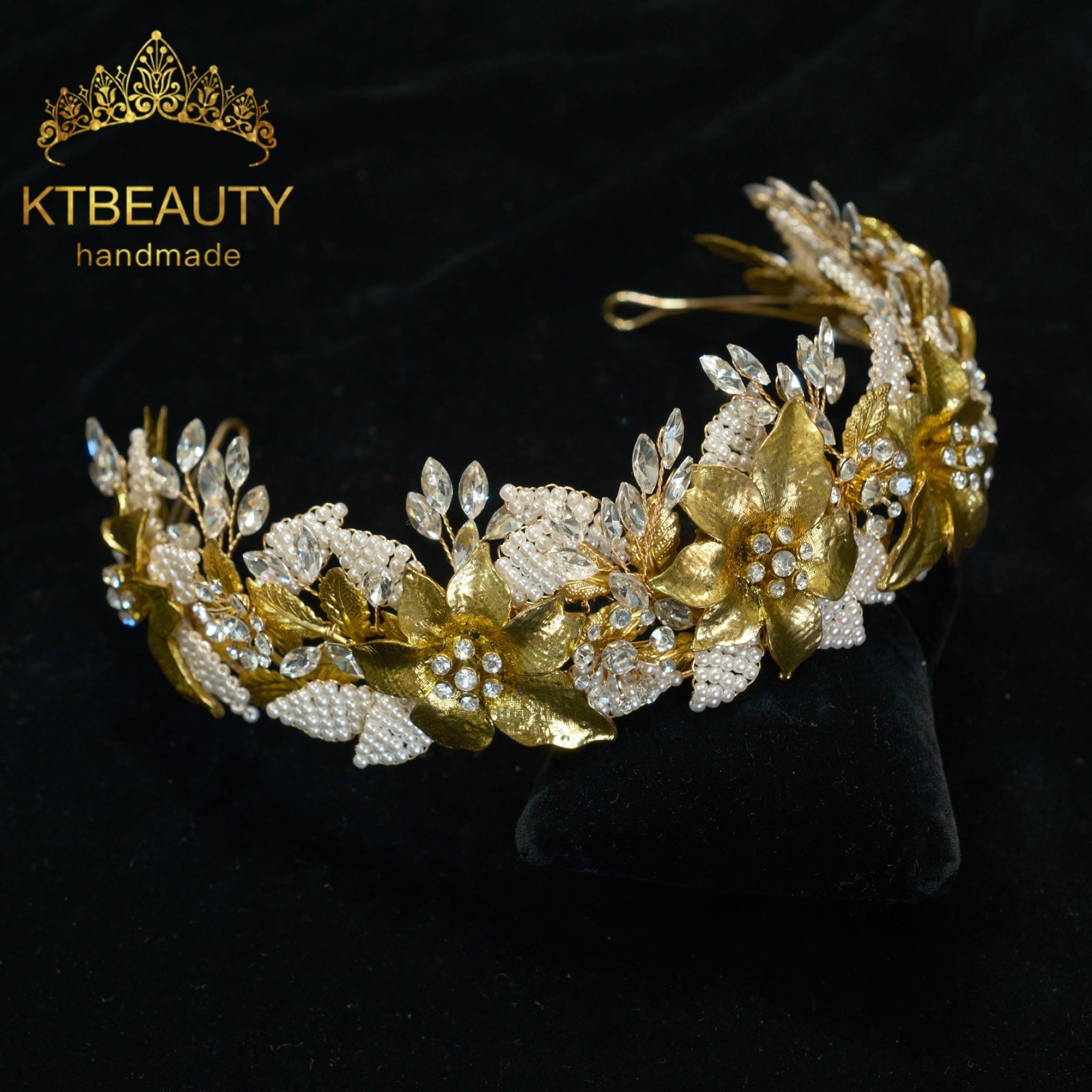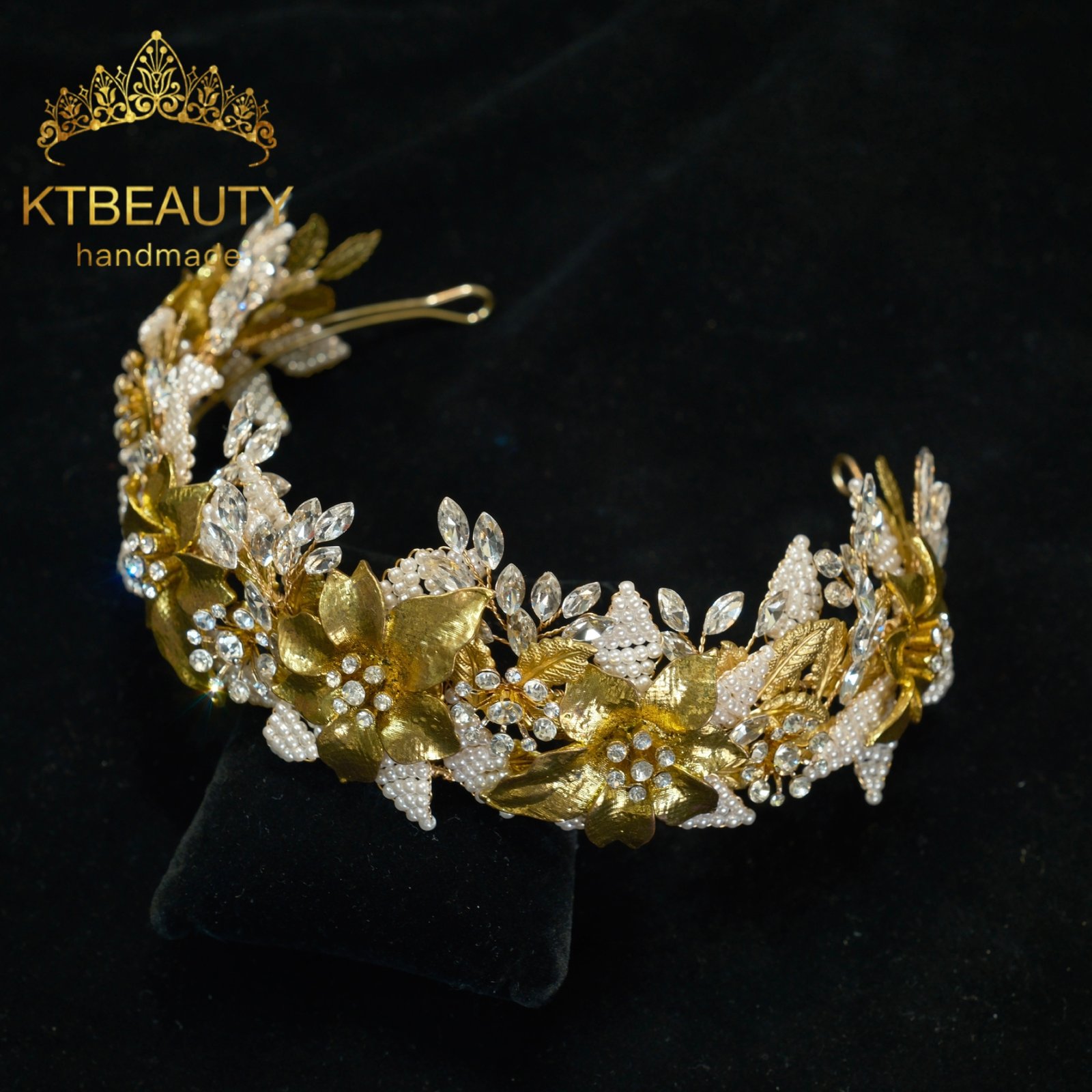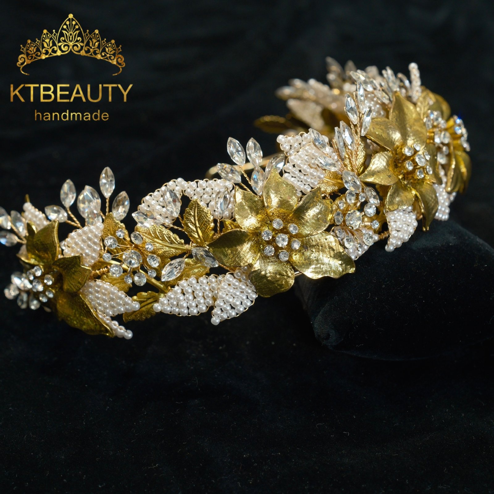 KTBEAUTY Gold Flower Handmade Bridal Headband With Pearl & Crystal Luxury Rhinestone Wedding Accessories For Formal Occasion