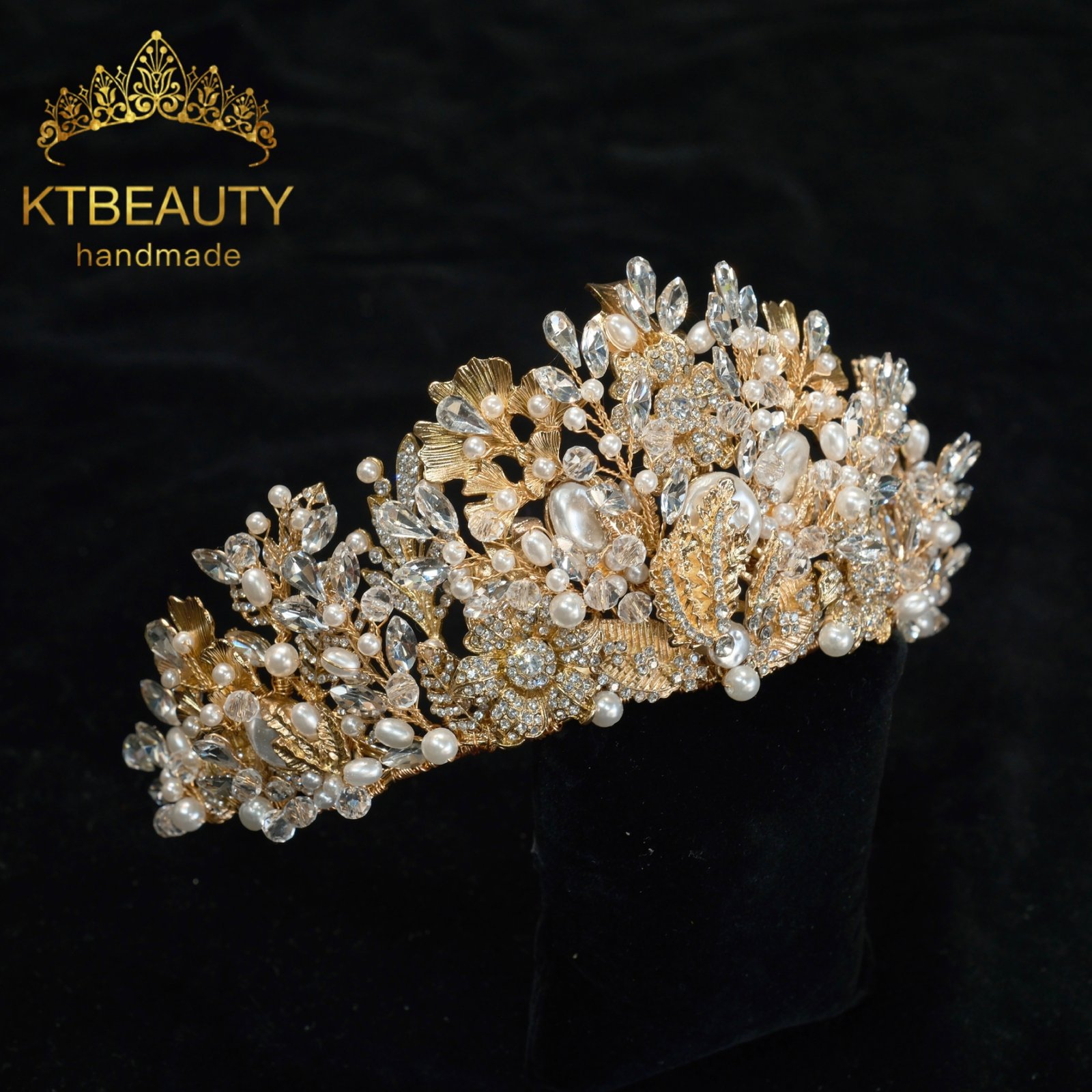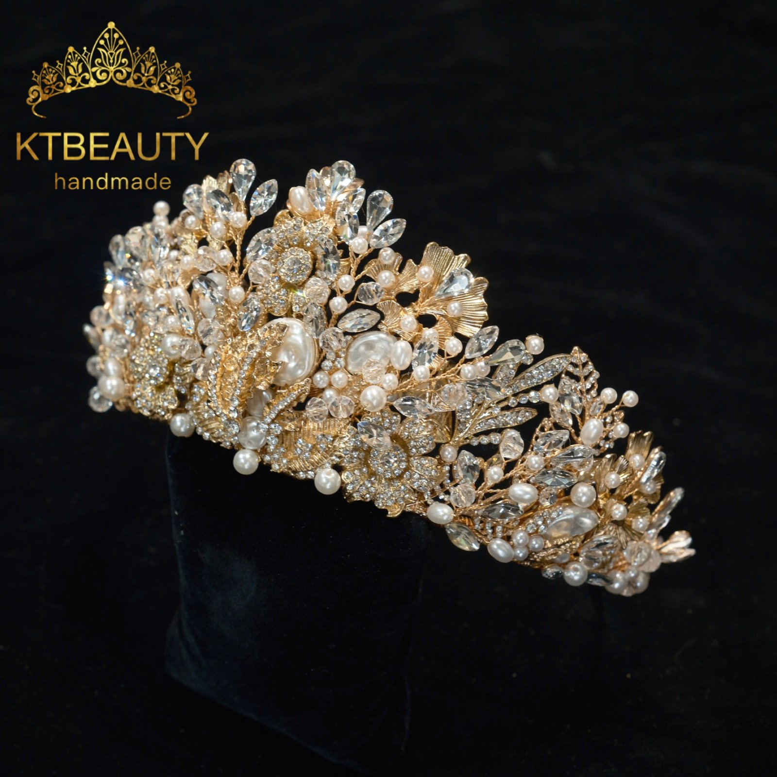 KTBEAUTY Gold Plated Pearl Crystal Bridal Tiara Handmade Luxury Rhinestone Wedding Crown for Bride Formal Occasion Pageant Hair Jewelry