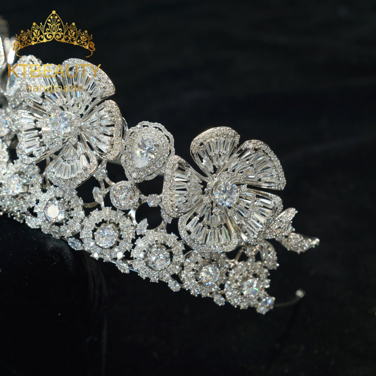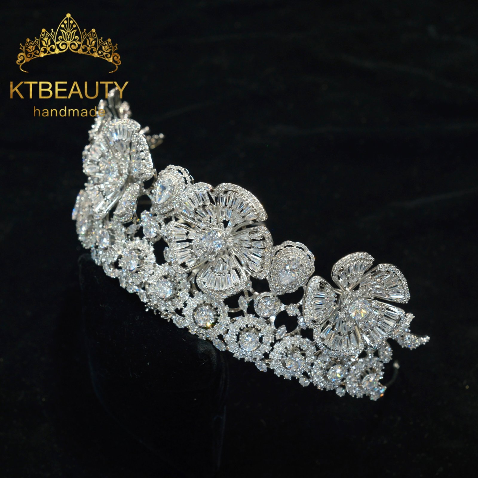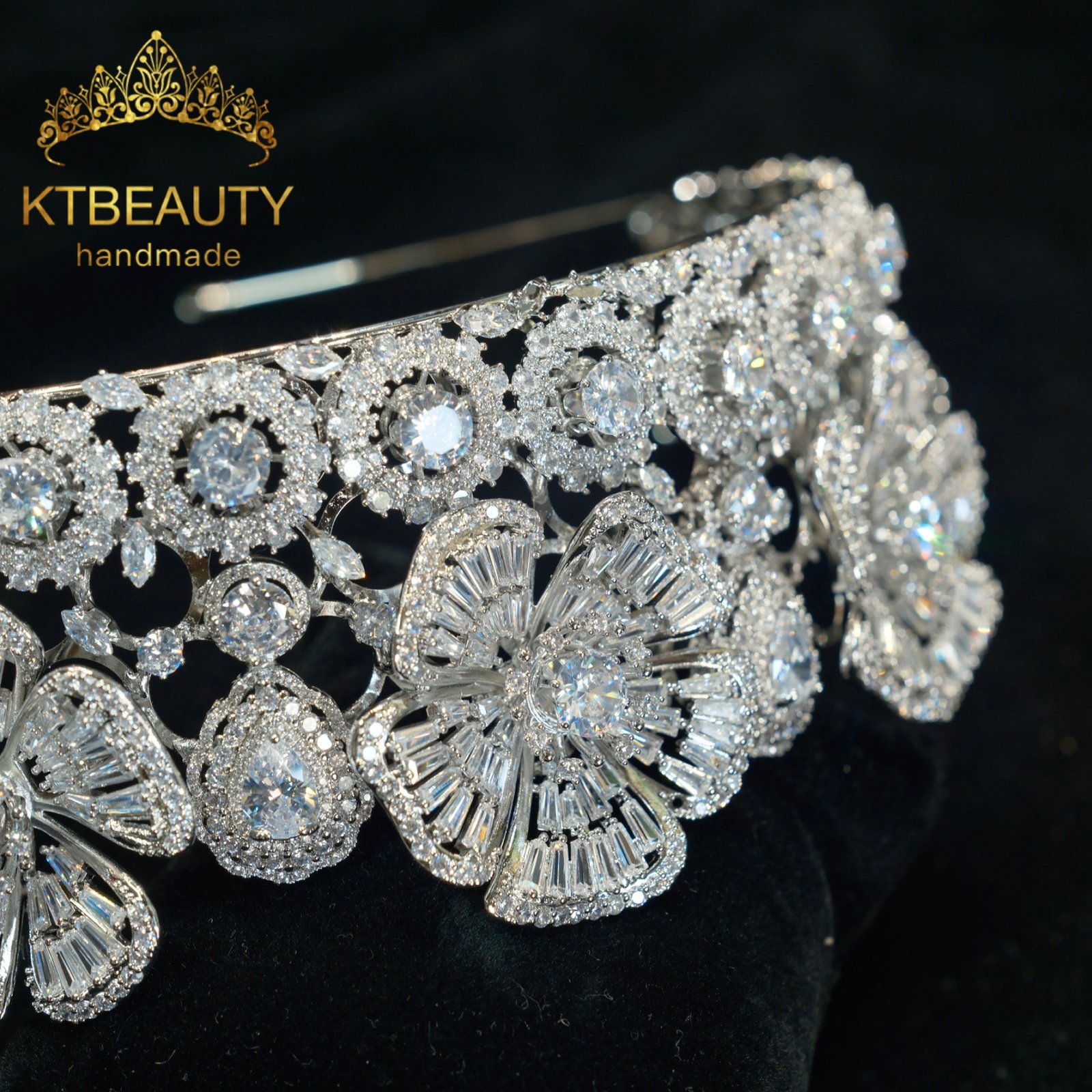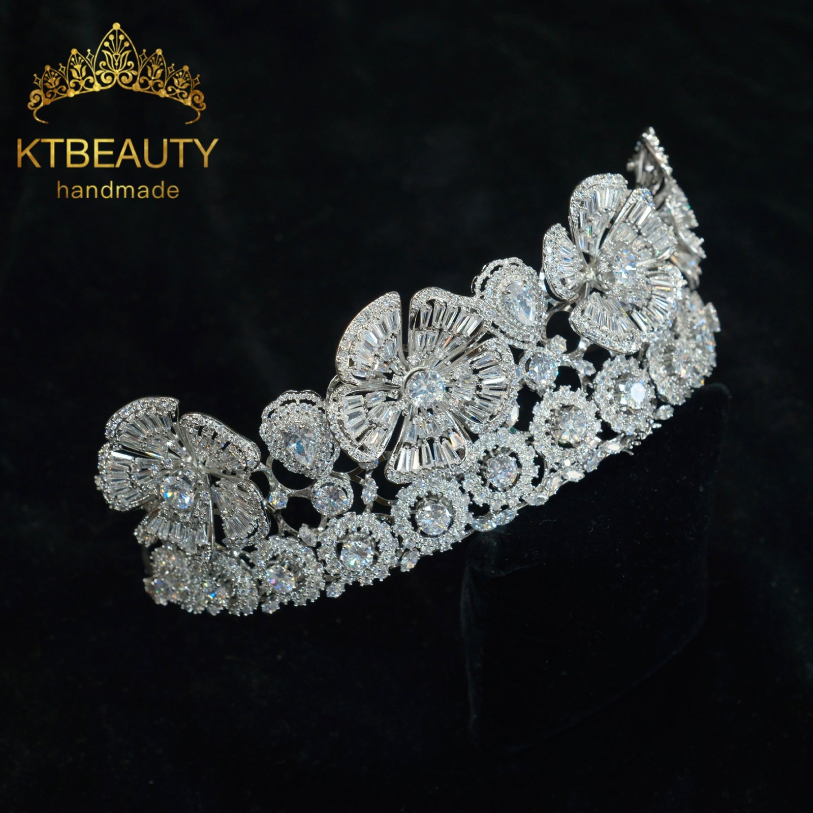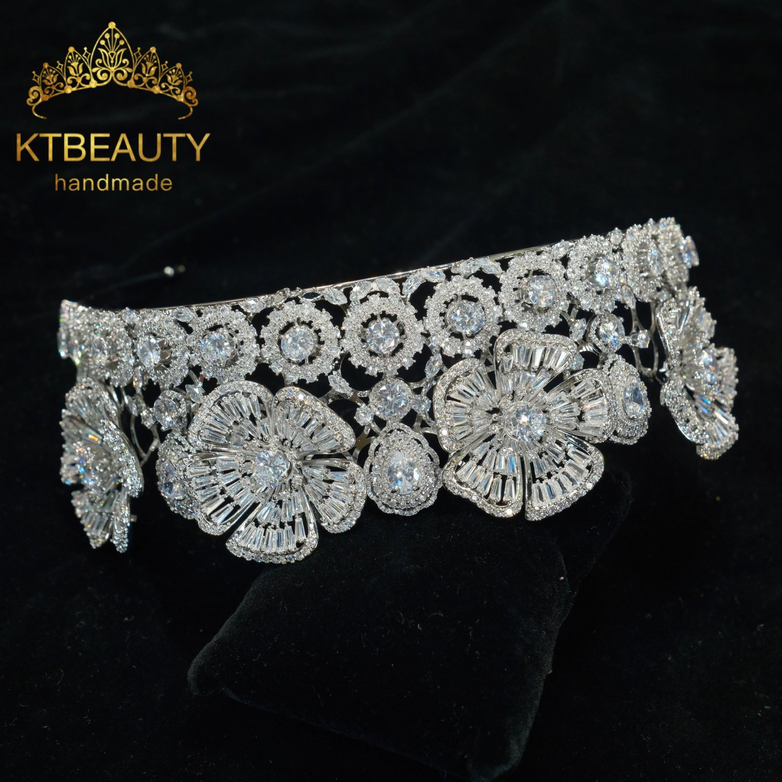KTBEAUTY Handmade Silver Zircon Flower Bridal Crown Luxury Rhinestone Wedding Tiara Crystal Queen Crown For Bride Pageant Hair Accessories
