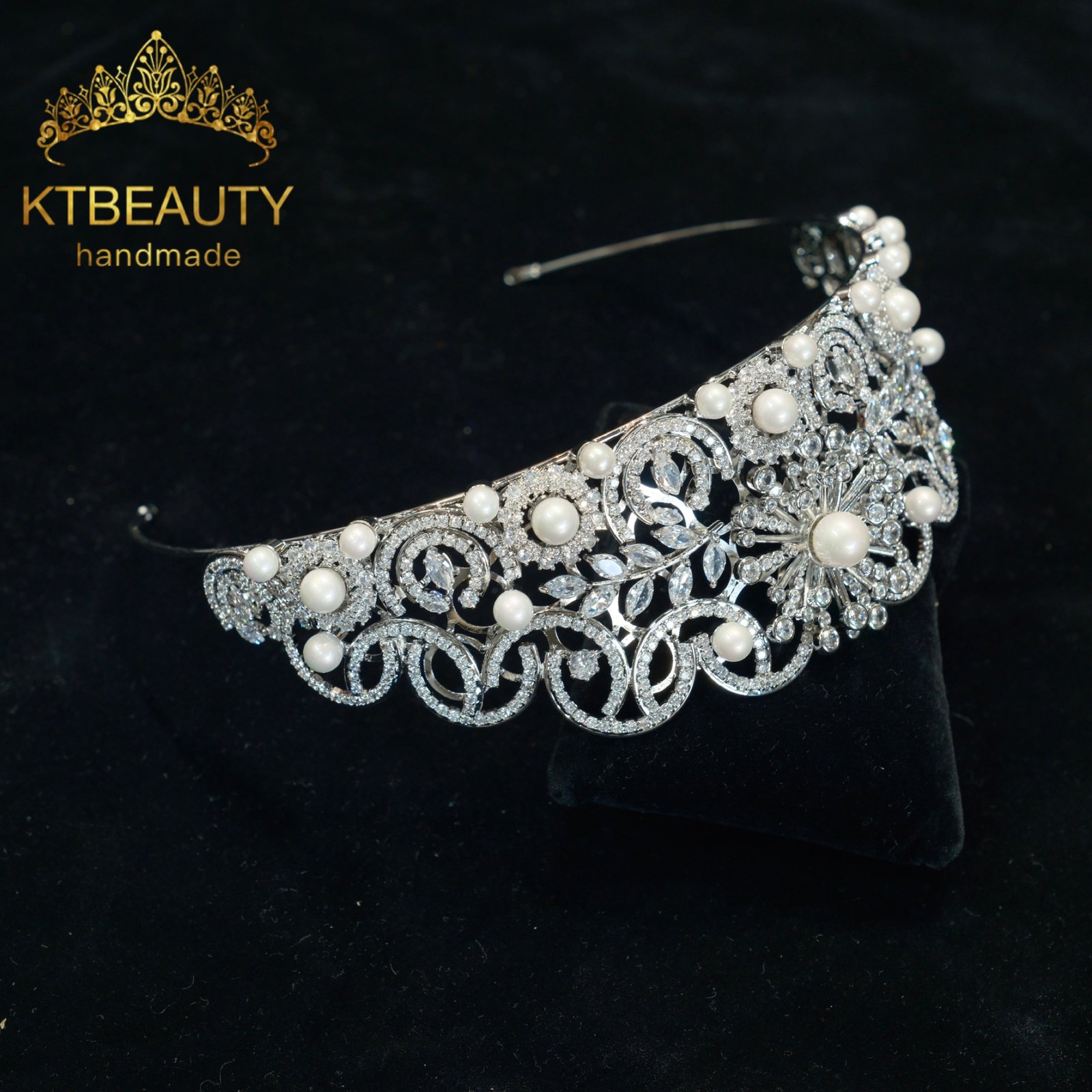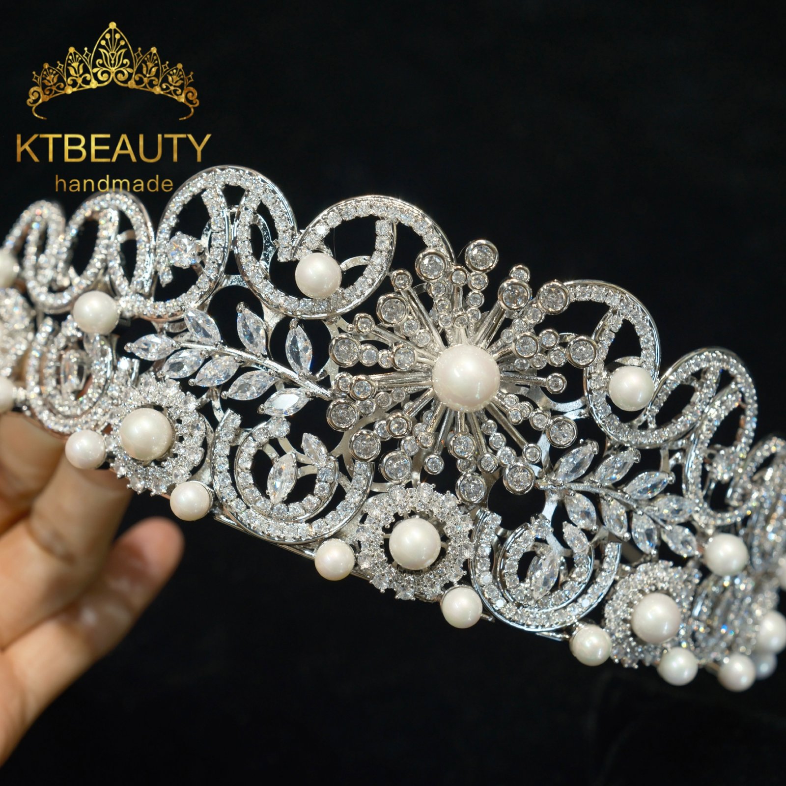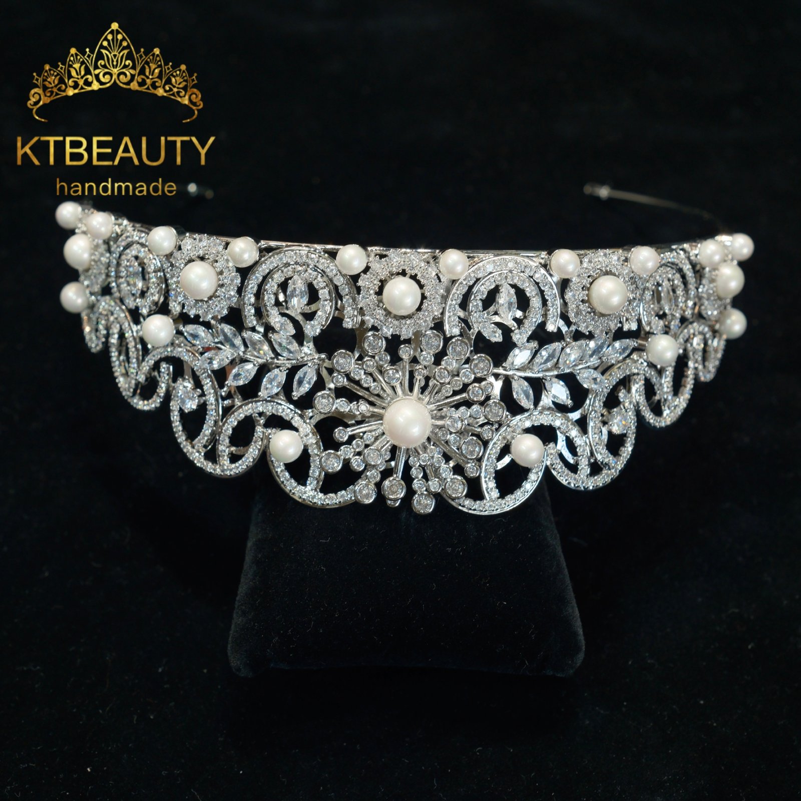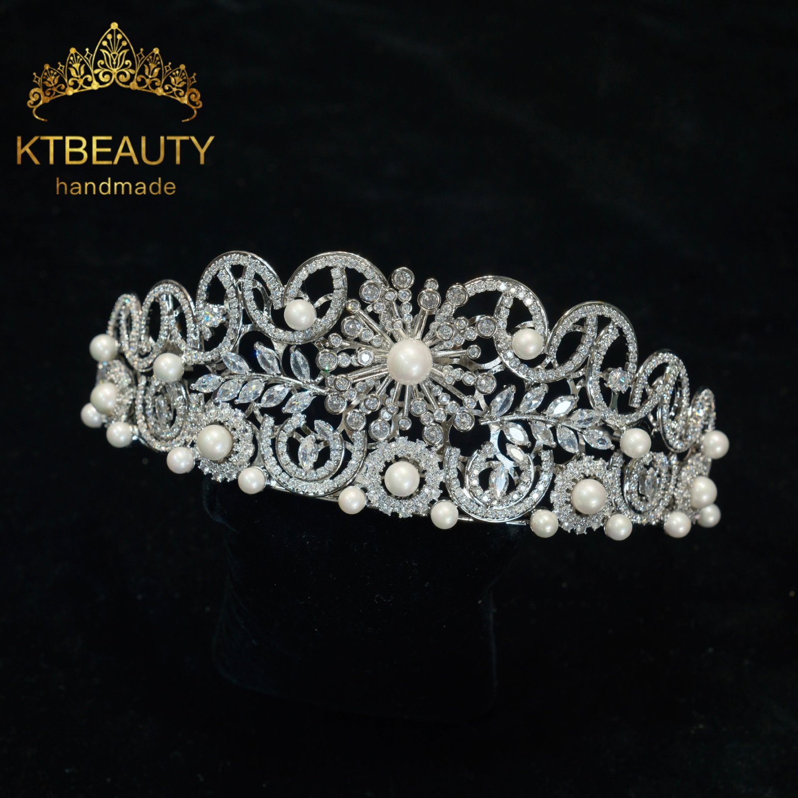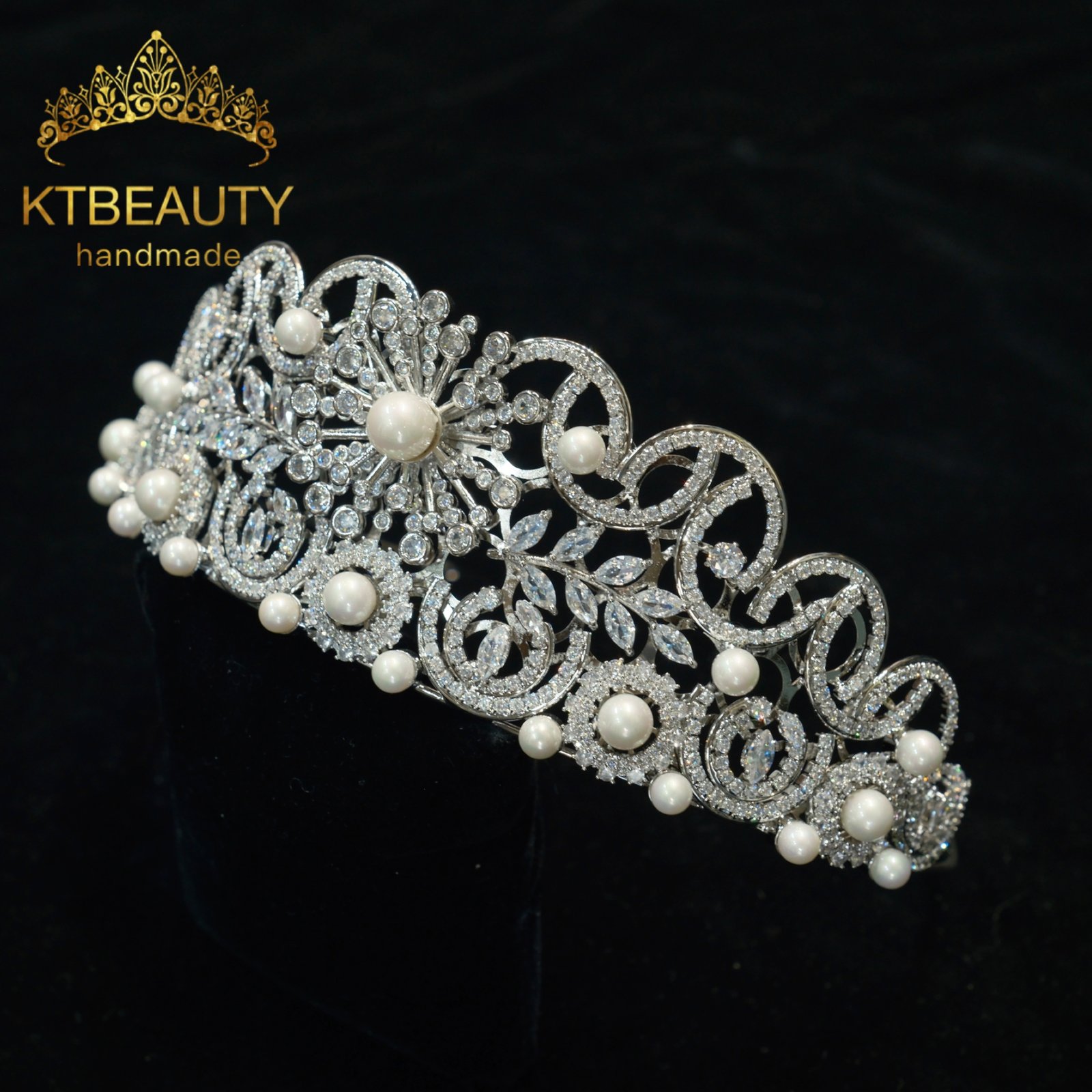 KTBEAUTY Silver Plated Pearl Zircon Bridal Tiara Handmade Floral Clear Stones Crown for Wedding Party Bride Hair Accessories